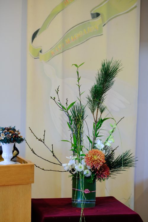 元旦礼拝の講壇横に活けられた生花(松竹梅、竹の器)